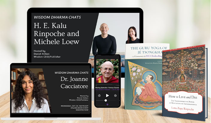 Register for one of our upcoming Wisdom Dharma Chats hosted by Daniel Aitken. In October, we’re hosting H. E. Kalu Rinpoche with his coauthor, Michele Loew, to discuss their new volume The Yoga of Niguma, and later in the month Daniel will be joined by Dr. Joanne Cacciatore, the bestselling author of Bearing the Unbearable.